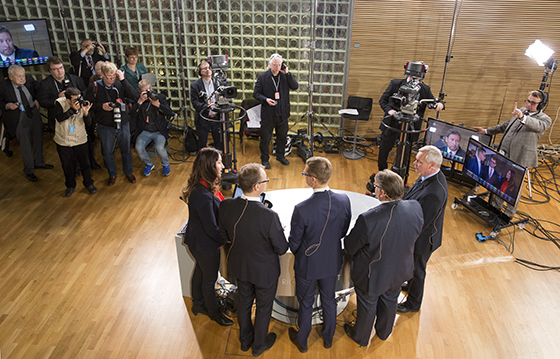 Eduskuntavaalien 2015 tulosilta eduskunnan Pikkuparlamentissa. Selin suurimpien puolueiden puheenjohtajat, oikealta Antti Rinne, Timo Soini, Alexander Stubb, Juha Sipilä sekä toimittaja.