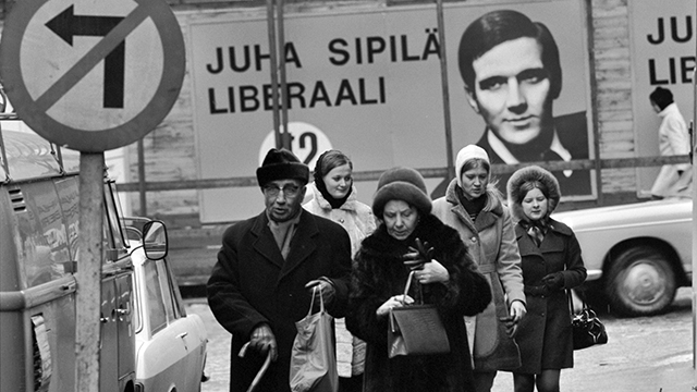 Eduskuntavaalien varmin merkki ovat kadunvarsiin ilmestyvät mainosrivistöt. Taustalla Juha Sipilän (lib) mainos vuodelta 1970. Kuva: Simo Rista / Helsingin kaupunginmuseo CC BY 4.0.