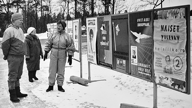 Eduskuntavaalimainoksia ihmettelemässä Vääksyssä vuonna 1991.