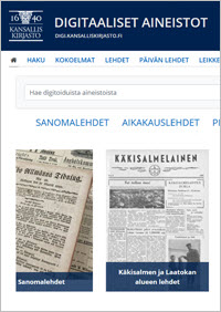 Kansalliskirjaston Digitaaliset aineistot ovat kaikkien saatavissa vapaassa verkkokäytössä. Aineistot sisältävät sanomalehtien ja aikakauslehtien lisäksi pienpainatteita, kirjoja, karttoja, nuotteja jne.