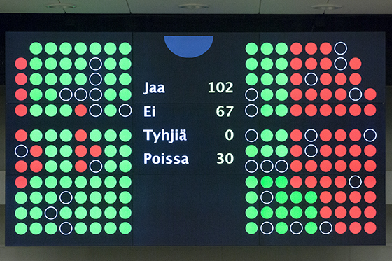 ​Hallitus nauttii eduskunnan luottamusta. Eduskunta äänesti luottamuksesta äänin 102-67.