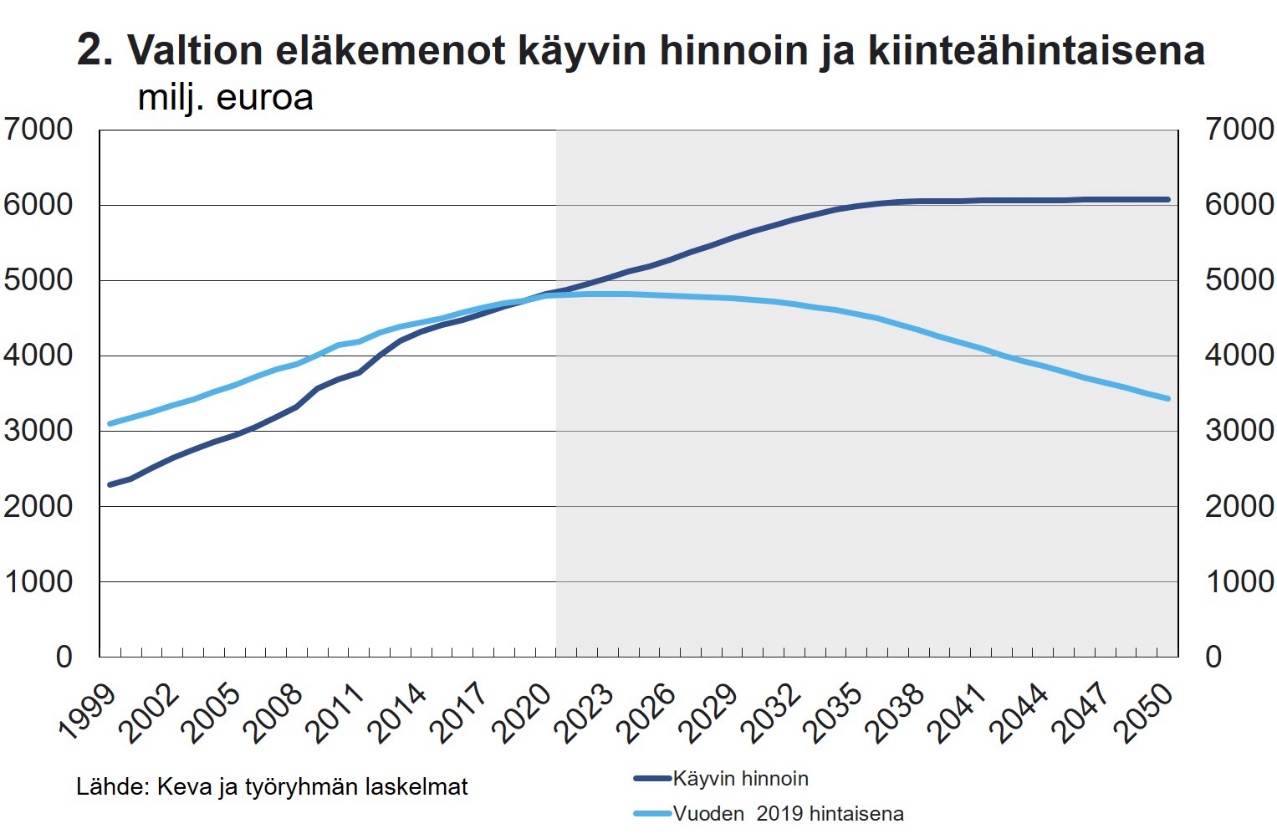 Valtion eläkemenot ovat kasvaneet tasaisesti viimeksi kuluneet 20 vuotta, mikä johtuu ennen kaikkea eläkeläisten määrän kasvusta. Valtion eläkemenot olivat 4,8 miljardia euroa vuonna 2020. Eläkemenot kasvavat nimellisesti vielä 2030-loppupuolelle asti, mutta reaalisesti valtion eläkemenot ovat jo saavuttamassa huippunsa (kuvio 2).