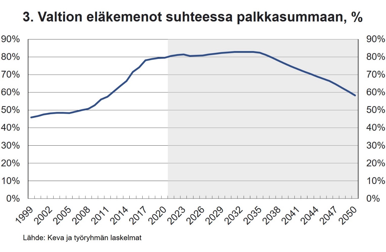Valtion eläkemenot suhteessa palkkasummaan ovat kohonneet yli 80 prosenttiin 2020-luvun alussa, ja sillä tasolla niiden ennakoidaan pysyvän 2030-luvun jälkipuoliskolle, jolloin menojen ennakoidaan kääntyvän laskuun (kuvio 3).