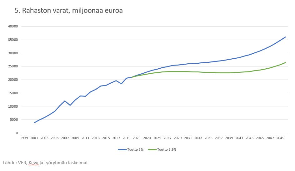 Talousarviosiirron lisäämisestä huolimatta rahaston euromäärinen koko kasvaisi edelleen. Rahaston koko olisi vuoden 2043 lopussa viiden prosentin tuotto-oletuksen toteutuessa noin 29 miljardia euroa ja 3,9 prosentin toteutumalla noin 23 miljardia euroa (kuvio 5).