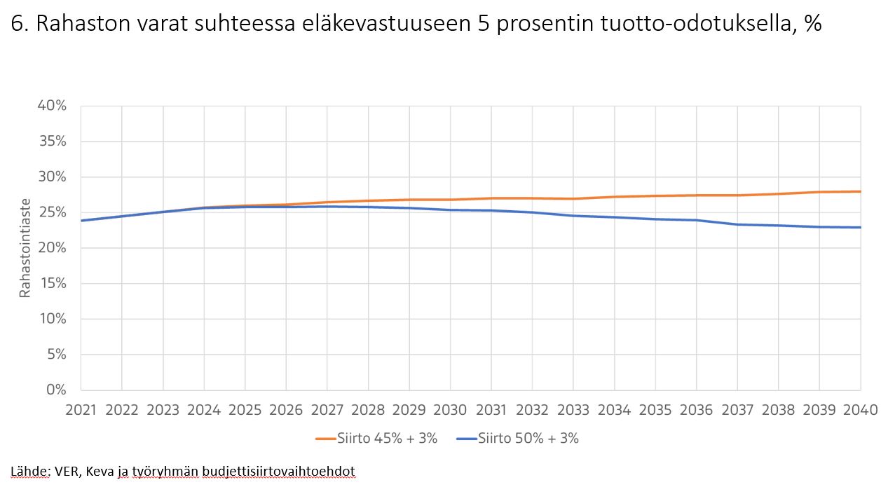 Rahaston talousarviosiirron kasvattaminen 50 prosenttiin vuoteen 2028 mennessä tasaisi eläkemenoja esitettyä 45 prosentin siirtoa voimakkaammin, mutta samalla eläkerahaston hallussa olevat varat alkaisivat valitulla 5 prosentin tuotto-odotuksella vähentyä. Talousarviosiirron kasvattaminen 50 prosenttiin kasvattaisi rahaston nettosiirron talousarvioon runsaaseen 1,2 miljardiin euroon 2030-luvulla.