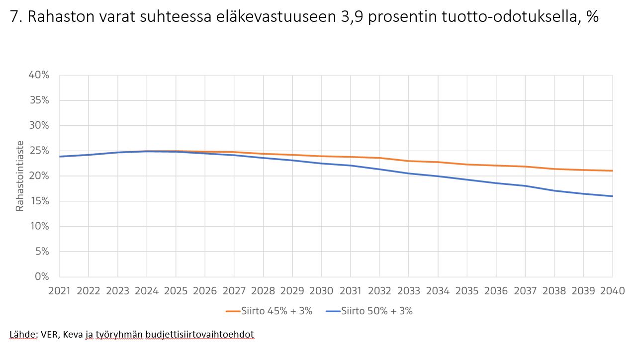 Eläkemaksuja kerätään rahastoinnin piirissä olevien palkkasummasta. Eläkemaksuperusteiden oletetaan pysyvän nykyisellään 24,4 prosentissa palkkasummasta. Valtion eläkemenot ovat kasvamassa reiluun 80 prosenttiin suhteessa palkkasummaan 2020-luvun alussa. Mikäli eläkemaksuperusteet pysyvät ennallaan, kuormittaa eläkemenon kasvu enenevässä määrin valtion talousarviota 2030-luvulla. Talousarviosiirron korottaminen 40 prosentista 45 prosenttiin eläkemenosta kasvattaa rahaston nettosiirtoa talousarvioon 8 prosentista noin 16 prosenttiin suhteessa eläkemenoon 2030-luvulle tultaessa. Muilla talousarvion tuloilla kustannettava osuus vähenisi vastaavasti.