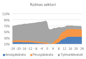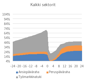 Ensimmäiset 8 viikkoa 100 %:lla muodostavat nykytilassa ja vaihtoehtoisessa tilassa saman etuusmenon; viikot 8–34 20 %-yksikköä vähemmän, ja loput 34+-viikot 25 %-yksikköä vähemmän. Luku 21,1 % saadaan skaalaamalla kukin luku sen osuudella kauden pituudesta.