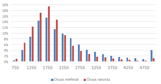 Kuvio 11 esittää ansiopäivärahan saajat porrastuksen perusteena olevien laskurikertymien mukaan vuoden 2022 lopussa sukupuolen mukaan. Porrastus vaikuttaisi jonkin verran enemmän miehiin kuin naisiin, sillä miehet ovat keskimäärin naisia pidempään ansiopäivärahalla kokonaan työttöminä. Naisilla osa-aikatöiden tekeminen etuuden saannin ohessa on miehiä yleisempää, mikä osaltaan lieventää vaikutusta naisiin sekä kohdejoukon koon että euromääräisen vaikutuksen kautta.