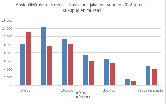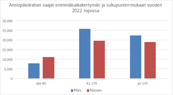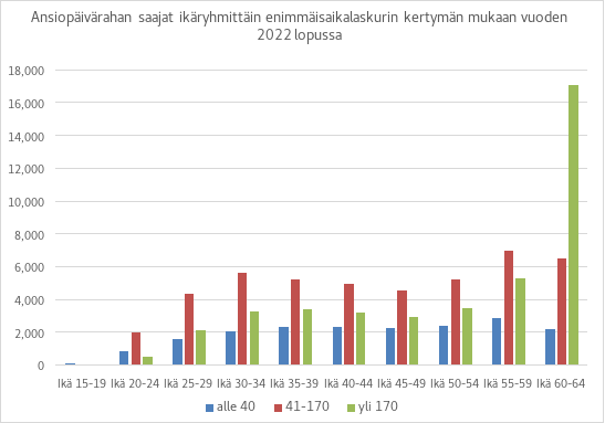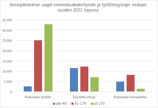 Ansiopäivärahaa sai vuoden 2022 lopussa noin 108 000 henkilöä, joista noin 45 000 henkilöllä ansiopäivärahan enimmäisaikalaskuriin oli kertynyt 41–170 päivää ja yli 170 päivää oli kertynyt noin 41 000 henkilöllä. Yli 170 päivältä ansiopäivärahaa saaneista noin 7 800 oli kuitenkin lisäpäivien ajalta etuutta saaneita.