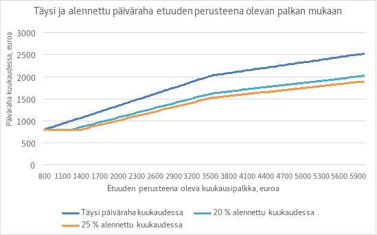 Ansiopäivärahan määrän alentamisen vaikutus kasvaisi euromääräisesti henkilön päivärahan tason mukaan. Kuvio 12 a havainnollistaa alennetun ja täyden päivärahan tasoa etuuden perusteena olevan palkan mukaan. Kuten kuviosta havaitaan, työttömällä työnhakijalla jonka ansiopäivärahan perusteena oleva palkka on matala, ansiopäivärahan tasoa suojaa se, että ansiopäiväraha on maksettava vähintään peruspäivärahan suuruisena.