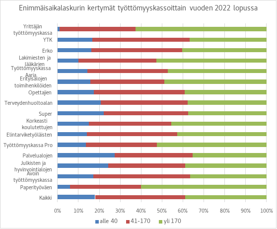Kuvio 15. Enimmäisaikalaskurin kertymät työttömyyskassoittain vuoden 2022 lopussa. Lähde: Finanssivalvonta