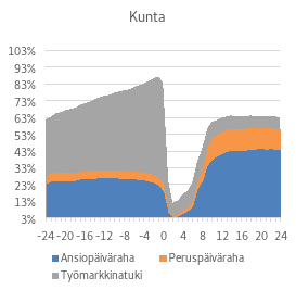 Ansiopäivärahan tason porrastusta koskevassa ehdotuksessa etuuden alentaminen kohdentuisi ansio-osaan, jolloin kuntien rahoitusvastuu ansiopäivärahan perusosamenosta säilyisi lähtökohtaisesti ennallaan vuoden 2025 alusta lukien. Toisaalta ehdotuksella arvioidaan olevan positiivisia työllisyysvaikutuksia, mikä vähentäisi kuntien rahoitusvastuuta työttömyysetuusmenoista ja kasvattaisi verotuloja.