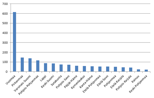 Pylväsdiagrammissa näkyy kiinteistöverokertymät maakunnittain vuoden 2017 maksuunpantujen kiinteistöverojen tiedoilla. Asteikolla kuvataan veron euromäärää miljoonina euroina, kun kiinteistöverotuotto on 1,79 miljardia euroa. Tuotosta reilu kolmannes kertyy Uudeltamaalta (34,3 %), noin kahdeksan prosenttia Pirkanmaalta (8,2 %) ja Varsinais-Suomesta (7,6 %). Kainuun ja Keskipohjanmaan osuudet ovat prosentin verran kokonaiskertymästä (1,3 % ja 1,1 % vastaavasti).