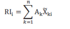 Kunkin talletuspankin i kokonaisriskiä kuvaava mittari RIi saadaan, kun lasketaan yhteen kunkin talletuspankin yksittäisten riskejä kuvaavien mittareiden lopulliset arvot, jotka on kerrottu kunkin yksittäisen riskejä kuvaavan mittarin painoarvolla Ak