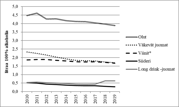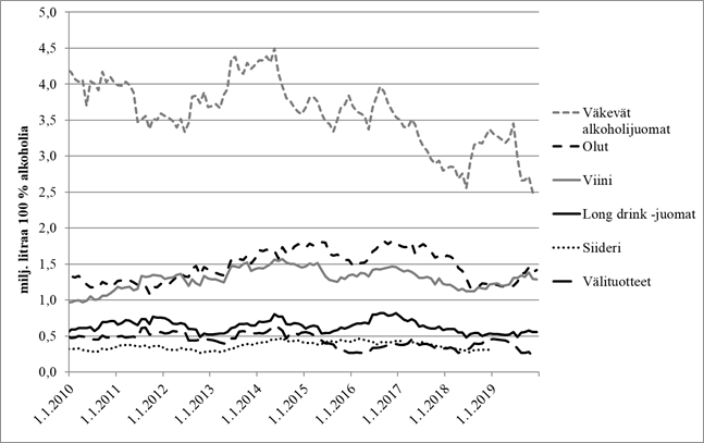 Lisäksi tarkastelussa olisi otettava huomioon, että alkoholin kotimainen saatavuus ja hinnoittelu riippuvat juomaryhmästä. Päivittäistavarakaupan piirissä alkoholin saatavuus on huomattavasti suurempaa ja hinnoittelu toimii markkinaehtoisesti, kun taas Alkon vähittäismyyntimonopolin piiriin kuuluvien juomaryhmien kotimaiseen myyntiin vaikuttavat muun muassa Alkon aukiolo-, sijoittautumis- ja hinnoittelupäätökset, joista säädetään ja päätetään suuremmassa määrin alkoholipoliittisin perustein. Juomaryhmistä esimerkiksi väkevät alkoholijuomat ovat tällä hetkellä sekä alkoholilain myötä rajoitetumman saatavuuden että alkoholiverolain myötä korkeamman verotuksen piirissä. Veronkorotuksen toteuttamisessa on myös otettava huomioon, että rakennedirektiivin säännökset tuoteryhmittäin sallituista veronporrastuksista rajoittavat veronkorotuksen kohdistamista juomaryhmän sisällä. Esimerkiksi etyylialkoholin tuoteryhmässä vero voidaan direktiivin mukaan porrastaa kahteen tasoon, mutta ainoastaan siten, että enintään 10 prosentin etyylialkoholille saadaan säätää tavanomaista verokantaa alhaisempi taso. Tämä tarkoittaa esimerkiksi sitä, että kyseiseen tuoteryhmään kuuluville etyylialkoholipohjaisille alkoholipitoisuudeltaan 5,5 tilavuusprosenttisille long drink -juomille voidaan säätää alempi, mutta ei korkeampaa verotasoa kuin tätä vahvemmille saman tuoteryhmän tuotteille. Oluen tuoteryhmässä pienpanimoille myönnettävän veronalennuksen lisäksi vain enintään 2,8 tilavuusprosenttia alkoholia sisältävälle oluelle voidaan säätää alennettu verotaso. Vuodesta 2022 lähtien raja nousee 3,5 tilavuusprosenttiin. Muilta osin verotason on oltava sama senttilitralta oluen sisältämää etyylialkoholia. Muiden mietojen käymisteitse valmistettujen juomien veron porrastaminen on direktiivin mukaan väljempää.