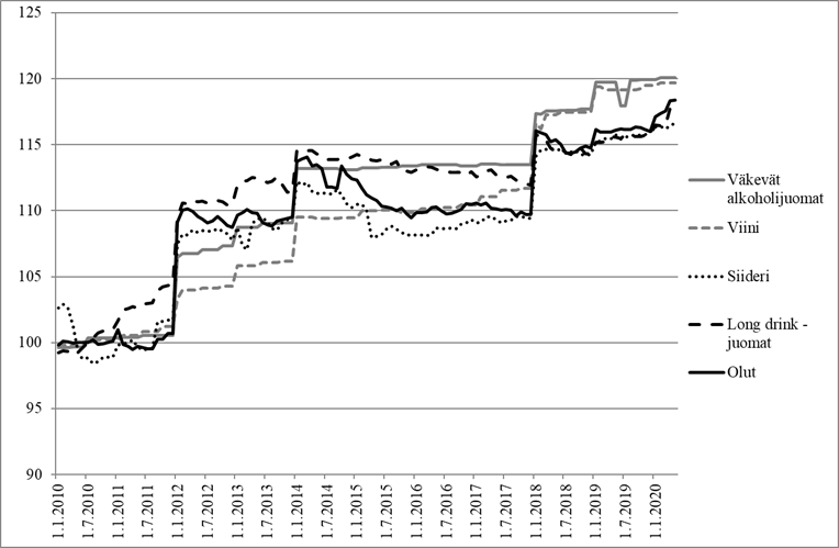 Vuoden 2008 alusta veroja korotettiin keskimäärin 11,5 prosenttia siten, että väkevien alkoholijuomien veroa korotettiin 15 prosenttia ja muiden alkoholijuomien 10 prosenttia. Vuonna 2009 alkoholiveroa korotettiin kahdesti 10 prosenttia kerrallaan. Vuonna 2012 korotettiin oluen ja mietojen käymisteitse valmistettujen alkoholijuomien veroa 15 prosenttia ja muiden juomien veroa 10 prosenttia. Vuoden 2014 alusta kaikkiin alkoholijuomiin tehtiin yhtä suuri korotus suhteessa sataprosenttiseen alkoholiin. Korotus oli keskimäärin 7 prosenttia. Vuoden 2018 veronkorotus toteutettiin painottaen muita kuin väkeviä alkoholijuomia siten, että väkevien alkoholijuomien euromääräinen veronkorotus oli noin kaksi kolmasosaa muiden juomaryhmien veronkorotuksesta sataprosenttista alkoholilitraa kohden. Korotus oli keskimäärin 10 prosenttia. Vuonna 2019 alkoholiveroja korotettiin keskimäärin 2,5 prosenttia. Korotus oli saman suuruinen kaikissa juomaryhmissä suhteessa sataprosenttiseen alkoholiin kuitenkin siten, että viinin veronkorotus oli lievästi muiden juomaryhmien korotusta suurempi.