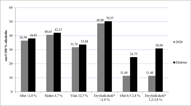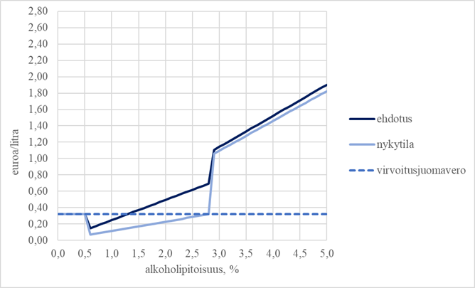Vähän alkoholia sisältävän oluen ja etyylialkoholi-veroluokan verotasoihin ehdotetaan muita juomaryhmiä suurempia korotuksia. Ehdotus lieventäisi sitä epäkohtaa, että alkoholittomista juomista perittävä virvoitusjuomavero on nykyisin korkeampi kuin vähän alkoholia sisältävän oluen tai etyylialkoholipohjaisen juoman alkoholivero litraa kohden laskettuna.