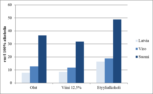 Viron verotasot ovat juomaryhmästä riippuen noin 35—40 prosenttia Suomen tasosta. Latvian verotasot ovat Viroa alhaisempia ja ovat noin 20—35 prosenttia Suomen verotasoista.