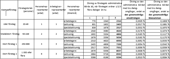 Yritysten keskimääräiset liikevaihdot vaihtelevat toimialoittain melko paljon. Taulukkoa tehdessä tarkasteltiin myös merkittävimpien toimialojen yritysten keskimääräisiä liikevaihtoja ja palkkasummia, ja laskettiin hallinnollisen taakan lisäyksen osuus niihin. Esimerkiksi pienen yrityksen tapauksessa, jossa henkilöstön edustaja on työntekijä, keskimääräisen liikevaihdon osuuden vaihteluväli oli 0,0150-0,0961%, pienin osuus oli tukku- ja vähittäiskaupassa, ja suurin terveys- ja sosiaalialalla. Eroja siis on, mutta osuus keskimääräisistä liikevaihdoista on silti kaikilla toimialoilla alle promillen.