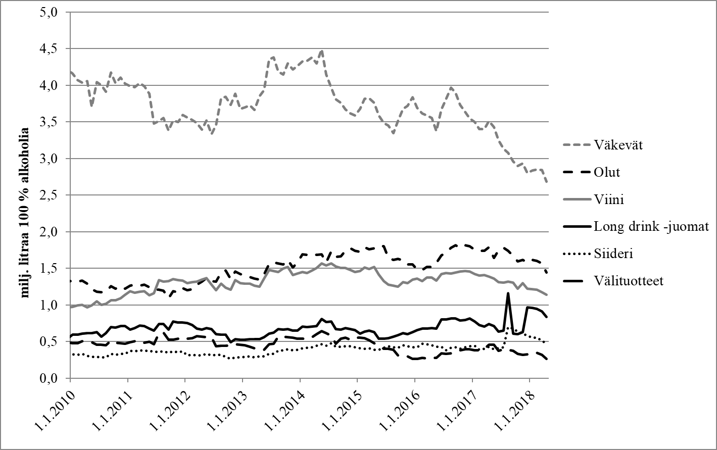 Vuoden 2018 tammi-kesäkuussa alkoholin tilastoitu kulutus on ollut pienessä laskussa kaikissa muissa juomaryhmissä kuin long drink -juomissa. Alkuvuoden kehityksen perusteella näyttää siltä, että päivittäistavarakaupan valikoimiin siirtyneiden vahvempien gin-pohjaisten long drink -juomien kulutus on kasvanut merkittävästi.