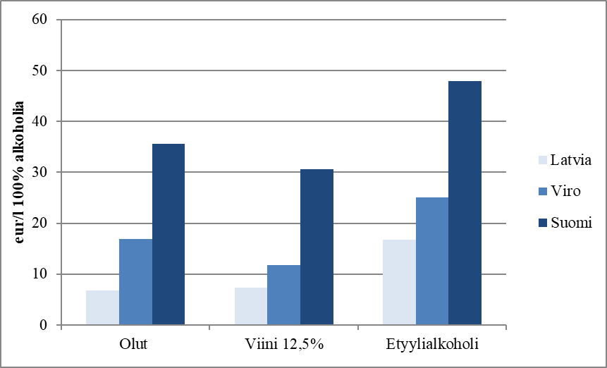 Latvia on viime vuosina korottanut alkoholiverojaan maltillisesti, mutta verotasot ovat Viron verotasoja selvästi alhaisempia. Näin ollen Suomen ja Latvian välinen alkoholijuomien hintaero on merkittävä.