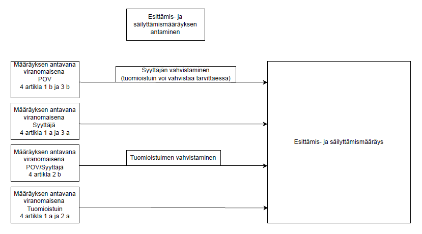 Eurooppalaisella esittämismääräyksellä tarkoitetaan päätöstä, jolla määrätään sähköisten todisteiden esittämisestä ja jonka jäsenvaltion oikeusviranomainen antaa tai vahvistaa 4 artiklan 1, 2, 4 ja 5 kohdan mukaisesti ja joka osoitetaan jollekin unionissa palveluja tarjoavan palveluntarjoajan nimetylle toimipaikalle tai lailliselle edustajalle, jos kyseinen nimetty toimipaikka tai laillinen edustaja sijaitsee toisessa jäsenvaltiossa, jota asetus sitoo. Eurooppalaisella säilyttämismääräyksellä tarkoitetaan päätöstä, jolla määrätään sähköisten todisteiden säilyttämisestä myöhemmän esittämispyynnön antamiseksi ja jonka jäsenvaltion oikeusviranomainen antaa tai vahvistaa 4 artiklan 3, 4 ja 5 kohdan mukaisesti ja joka osoitetaan jollekin unionissa palveluja tarjoavan palveluntarjoajan nimetylle toimipaikalle tai lailliselle edustajalle, jos kyseinen nimetty toimipaikka tai laillinen edustaja sijaitsee toisessa jäsenvaltiossa, jota asetus sitoo.
