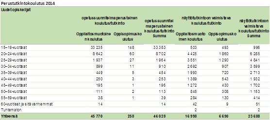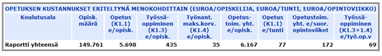 Luku- ja kirjoitustaidon opetus | 835 Työ- ja elinkeinoministeriön ilmoittama opiskelijoiden lukumäärä | 7 533,00 Työ- ja elinkeinoministeriön ilmoittama vuoden 2015 opiskelijatyöpäivän hinta 41,85 euroa kerrottuna 180 päivällä. Työ- ja elinkeinoministeriö on ilmoittanut koulutuksen keskimääräiseksi kestoksi 160-200 päivää | 6 290 000 Työ- ja elinkeinoministeriön mukaan vuoden 2015 toteutunutta kokonaiseuromäärää ei ole tiedossa johtuen siitä, että hankinnat eivät ole kohdistuneet kustannusseurannassa tapahtuneen koodimuutoksen takia oikein | 22 545 |