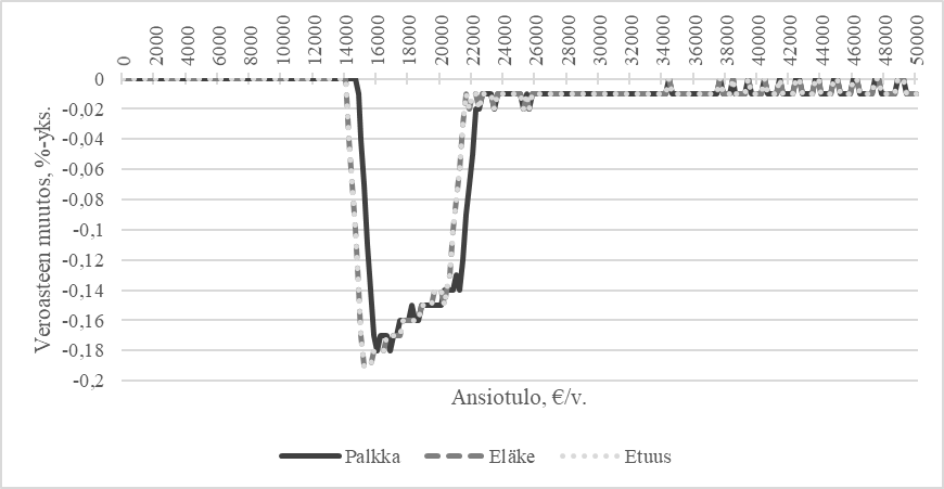 Kuviossa alla esitetään ehdotetun muutoksen vaikutus keskimääräiseen veroasteeseen eri tulonsaajilla eri tulotasoilla.