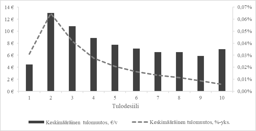 Alla olevaan kuvioon on koottu tässä esityksessä ehdotetun henkilön yleisradioveron alentamisen vaikutukset tulodesiileittäin. Kuviosta käy ilmi, että verotus kevenee kaikissa tulodesiileissä. Vaikutus on sekä euromääräisesti että suhteellisesti suurin tulodesiilissä 2 eli pienituloisilla kotitalouksilla. Kuviossa esitetyt muutokset on laskettu OECD:n modifioidun ekvivalenssiasteikon mukaisilla kotitalouskohtaisilla ekvivalenteilla tuloilla.