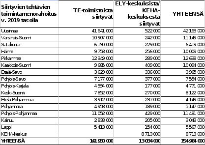 Julkisten työvoimapalvelujen järjestämisvastuu siirrettäisiin työ- ja elinkeinotoimistoilta kunnille. Kunnille siirtyisivät myös elinkeino-, liikenne- ja ympäristökeskusten julkisiin työvoimapalveluihin liittyvät hankintatehtävät ja elinkeino-, liikenne- ja ympäristökeskusten sekä työ- ja elinkeinotoimistojen kehittämis- ja hallintokeskuksen julkisiin työvoimapalveluihin liittyvät maksatustehtävät. Nykyiset työ- ja elinkeinotoimistot lakkautettaisiin. Siirtyviä tehtäviä valtiolla hoitava henkilöstö siirtyisi liikkeenluovutuksella kuntiin tai kuntayhtymiin.
