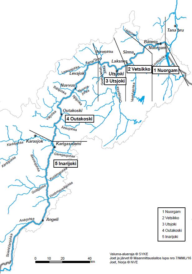 1 §.Soveltamisalue. Pykälässä määrätään, että kalastussääntö on voimassa sillä osalla Tenojokea, Inarinjokea ja Skietshamjokea, joka muodostaa Suomen ja Norjan välisen valtakunnan rajan. Norja antanee kansallisen kalastussäännön omalle rajajokiosuudelleen. Norjalle kuuluvalla Tenon alaosalla kalastussäännön kalastusta koskevat määräykset eivät voi olla lievempiä kuin rajajokiosuudella kulloinkin voimassa olevat määräykset. Tenon sivujokia koskevat kalastussäännöt määritellään kansallisesti ja ne voivat vaihdella sivuvesien lohikantojen tilanteen mukaisesti.