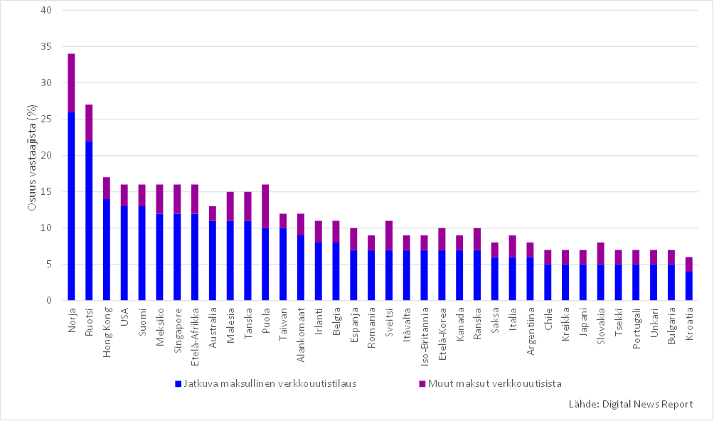 Digital News Reportin Suomen maaraportin mukaan varsin pieni osa väestöstä maksaa verkkouutisista. Kyselyyn vastanneista suomalaisista 16 prosenttia ilmoitti maksaneensa verkkouutisista kyselyä edeltäneen vuoden aikana. Osuus on pysynyt viime vuosina suhteellisen vakiona, vaikka samanaikaisesti yhä useammat suomalaislehdet ovat ottaneet käyttöön niin sanottuja maksumuureja. Verkkouutisista maksaneista 39 prosenttia on tehnyt jatkuvan tilauksen digitaalisesta uutispalvelusta. Yksittäisestä artikkelista tai julkaisusta tehtäviä kertamaksuja kyselyä edeltävän vuoden aikana oli tehnyt 12 prosenttia vastaajista. Verkkouutisista maksaminen on yleisempää nuorten ja suurituloisten keskuudessa. Reunanen (2019).