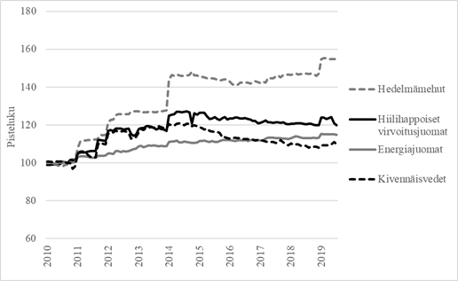 Esimerkkijuoma | Hinta 2019, eur/l | Hintamuutos, eur/l | Hintamuutos, % |