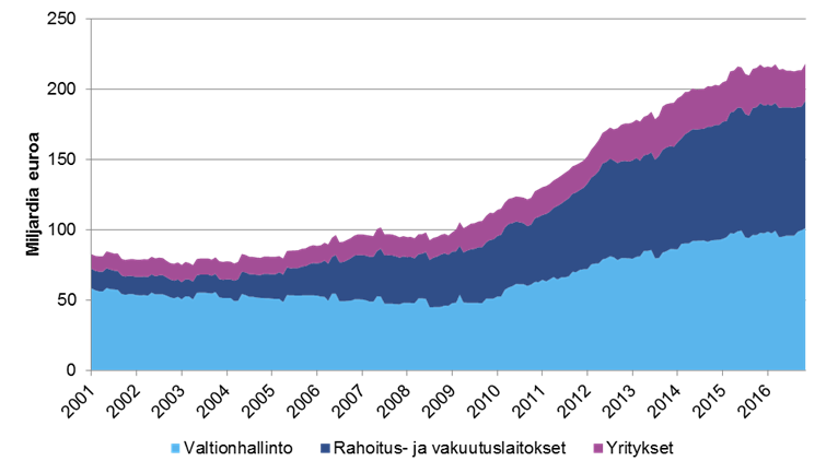 Kuva 3. Kotimaisten toimijoiden kaikkialla liikkeeseen laskettujen joukkolainojen määrä on kasvanut (joukkolainojen nimellisarvoinen kanta vuosina 2001—11/2016)