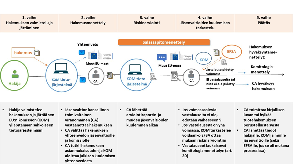 Kuva 1: Avoimen käytön direktiivin C-osan mukaisen tuotehakemuksen tietojen uusi käsittelyprosessi EU:ssa salassapitomenettelyineen. CA = toimivaltainen viranomainen (engl. Competent Authority).
