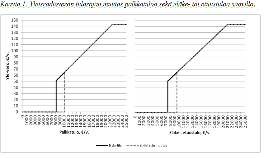 Kevennys ehdotetaan toteutettavaksi korottamalla henkilön yleisradioveron pienin maksettava määrä nykyisestä 51 eurosta 70 euroon. Tuloraja, josta lähtien henkilön yleisradioveroa olisi maksettava, nousisi palkansaajilla nykyisestä noin 8 120 eurosta 10 914 euroon ja eläkeläisillä sekä etuustulon saajilla 7 500 eurosta 10 294 euroon, (kaavio alla).