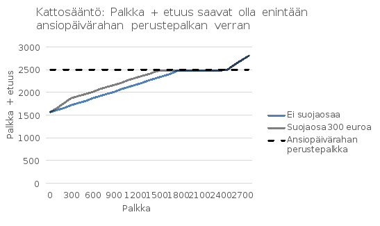 5 §.Etuuden määrä. Pykälän 1 momentti sisältää sovitellun työttömyysetuuden laskukaavan. Sen mukaan soviteltu työttömyysetuus lasketaan siten, että etuus ja 50 prosenttia saadun tulon siitä osasta, joka ylittää suojaosan, voivat sovittelujakson aikana yhteensä nousta määrään, joka etuutena muutoin olisi voitu maksaa. Pykälän 2 momentissa säädetään suojaosan määrästä. Suojaosan määrä on 300 euroa, jos etuus perustuu kuukauden sovittelujaksoon, ja 279 euroa, jos etuus perustuu neljän peräkkäisen kalenteriviikon sovittelujaksoon.