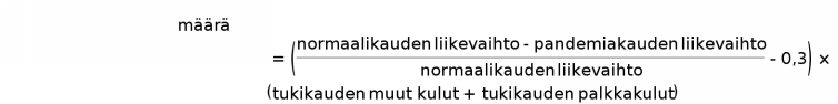 Pykälän kolmannen momentin mukaan tuki-intensiteetti laskettaisiin seuraavasti: [(yrityksen liikevaihto 1 maaliskuuta ja 31 toukokuuta 2019 – yrityksen liikevaihto 1 maaliskuuta ja 31 toukokuuta 2021) : yrityksen liikevaihto 1 maaliskuuta ja 31 toukokuuta 2019] – 0,3. Tukien intensiteetin enimmäismäärä olisi 70 prosenttia, tuen määrä enintään 1 000 000 euroa. Tuesta vähennettäisiin tukikaudelle kohdistuvat vakuutuskorvaukset ja muut samoihin kustannuksiin saadut valtiontuet. Tukea myönnettäessä otettaisiin huomioon, ettei Euroopan komission päätöksen SA.XXX mukainen tukien konsernikohtainen enimmäismäärä, 10 miljoonaa euroa, ylity.