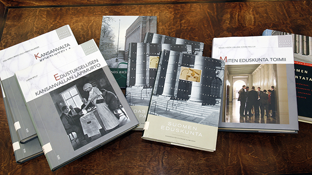 Suomen kansanedustuslaitoksen historia 1–12 / Eduskunnan historiakomitea. Helsinki, 1958–1982. 12 osaa. – Tillgång till Suomen kansanedustuslaitoksen historia -publikation i Riksdagsbiblioteket