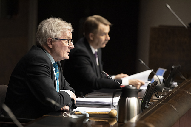 ​Finansutskottets ordförande Johannes Koskinen (sd) och vice ordförande Arto Pirttilahti (cent) höll presskonferens via Teams. ​