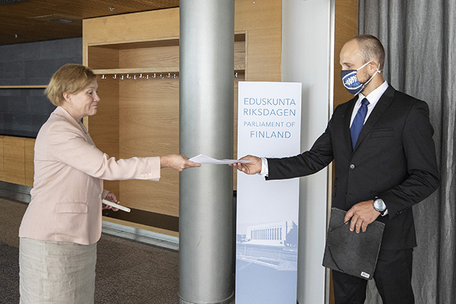 Medborgarinitiativet om att tillåta jakt på vitkindad gås överlämnades till riksdagen onsdagen den 19 augusti. Medborgarinitiativet togs emot av riksdagens lagstiftningsdirektör Tuula Kulovesi.