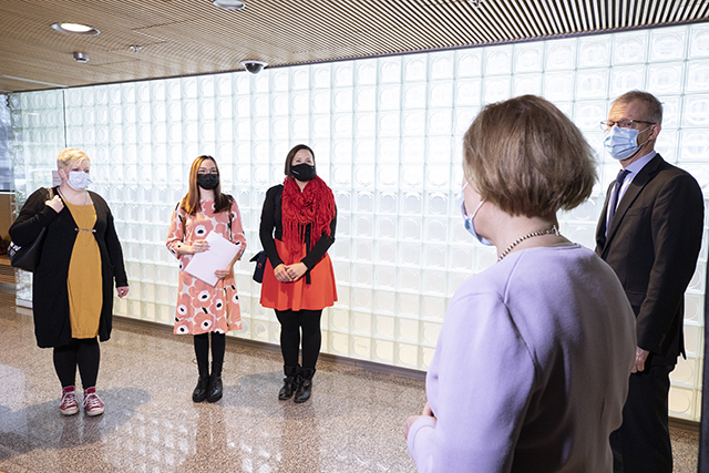 ​Hanna Poutanen, Tatja Jukuri och Marianne Syvänen överlämnade medborgarinitiativet till riksdagens lagstiftningsdirektör Tuula Kulovesi. Med på bilden riksdagens biträdande generalsekreterare Timo Tuovinen.