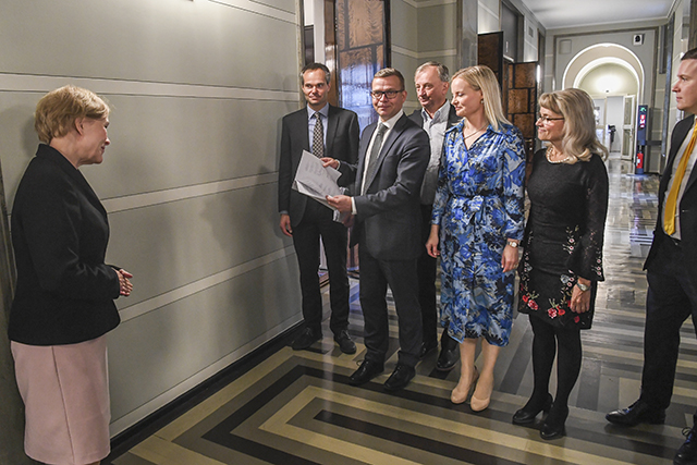 Riksdagsledamöterna Kai Mykkänen, Petteri Orpo, Harry Harkimo, Riikka Purra, Päivi Räsänen och Ville Tavio överlämnade interpellationen till riksdagens lagstiftningsdirektör Tuula Kulovesi.