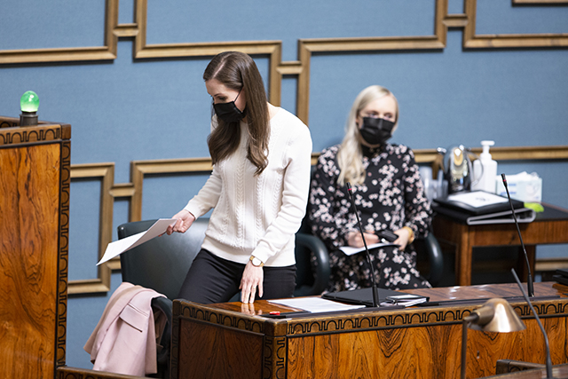 Statsminister Sanna Marin (sv) gav upplysningen om regeringens plan för att avveckla coronarestriktionerna till riksdagen. I bakgrunden inrikesminister Maria Ohisalo (gröna).