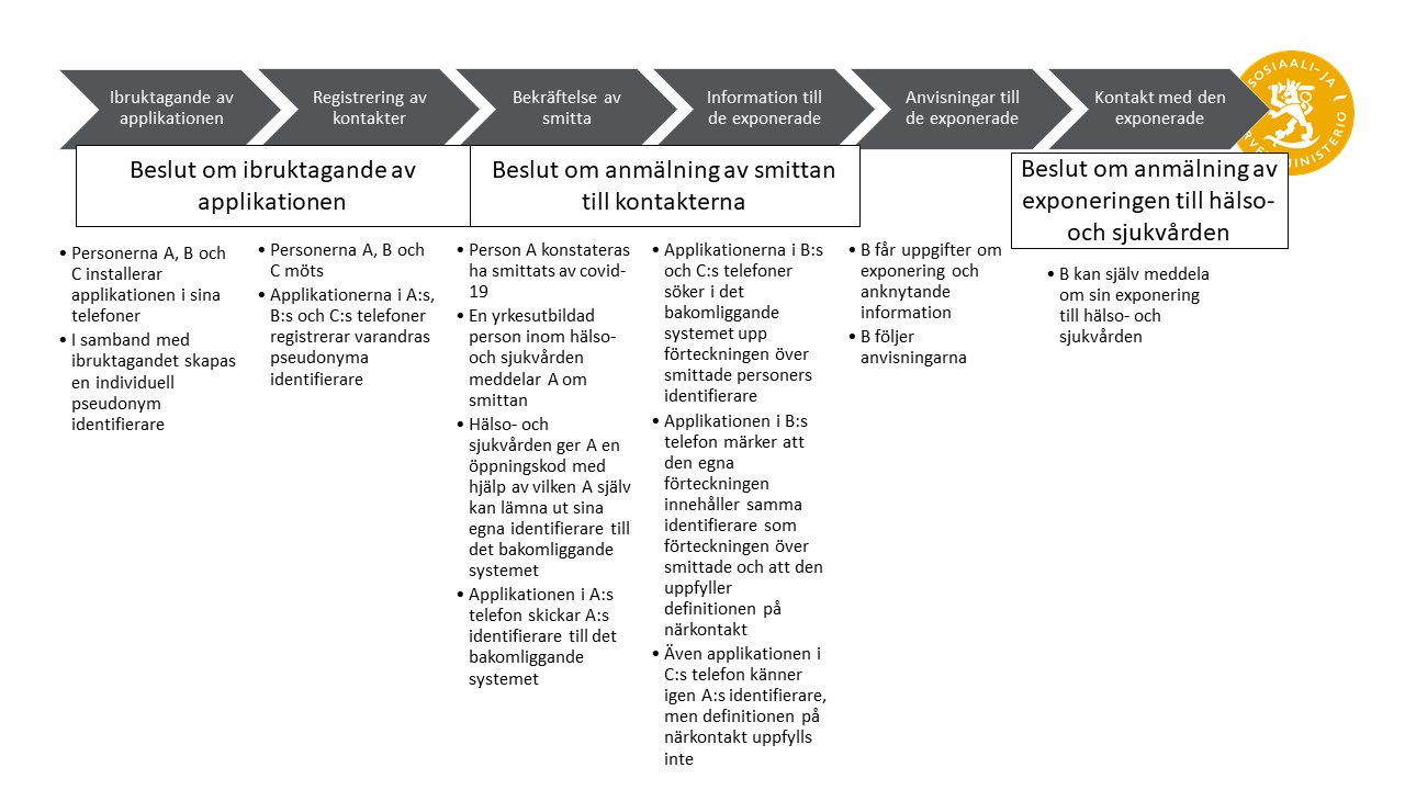Ibruktagandet av applikationen innebär att användarens personuppgifter kommer att behandlas, varvid bestämmelserna om dataskydd och olika persongruppers möjligheter att förstå hur de personuppgifter som gäller honom eller henne behandlas ska beaktas. Genom att sända en begäran om kontakt med hjälp av applikationen kan användaren lämna ut en eventuell uppgift om exponering som fåtts via informationssystemet till en verksamhetsenhet inom hälso- och sjukvården, om han eller hon beslutar att göra detta. Vid behandlingen av uppgifter om exponering inom hälso- och sjukvården tillämpas patientlagen.