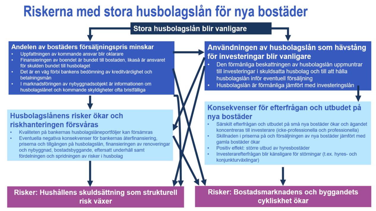 11 a §.Begränsningar som gäller krediter till bostadssammanslutningar. Den föreslagna paragrafen är ny. Genom den införs begränsningar för krediter som beviljas bostadssammanslutningar. Syftet med åtgärderna är att begränsa den kreditgivningspraxis som uppkommit i samband med nybygge av bostäder och på så sätt dämpa hushållens växande skuldsättning genom lån till bostadssammanslutningar. Bestämmelsen är inte avsedd att gälla finansieringen av renoveringsprojekt, eftersom de inte har ansetts vara förenade med motsvarande problem som nybyggnad. Den växande skuldsättning som sker genom krediter till bostadssammanslutningar ska enligt förslaget särskilt dämpas genom att de kreditbelopp som beviljas bostadssammanslutningar begränsas och en ny maximal återbetalningstid införs. För att förhindra att regleringen kringgås är det behövligt att fastställa lika långa begränsningar av löptiden för lån till husbolag som för bostadslån. Vidare är avsikten att skapa klarhet i helhetsbilden av lånekostnaderna genom att förbjuda amorteringsfria perioder under de första åren av lånet.