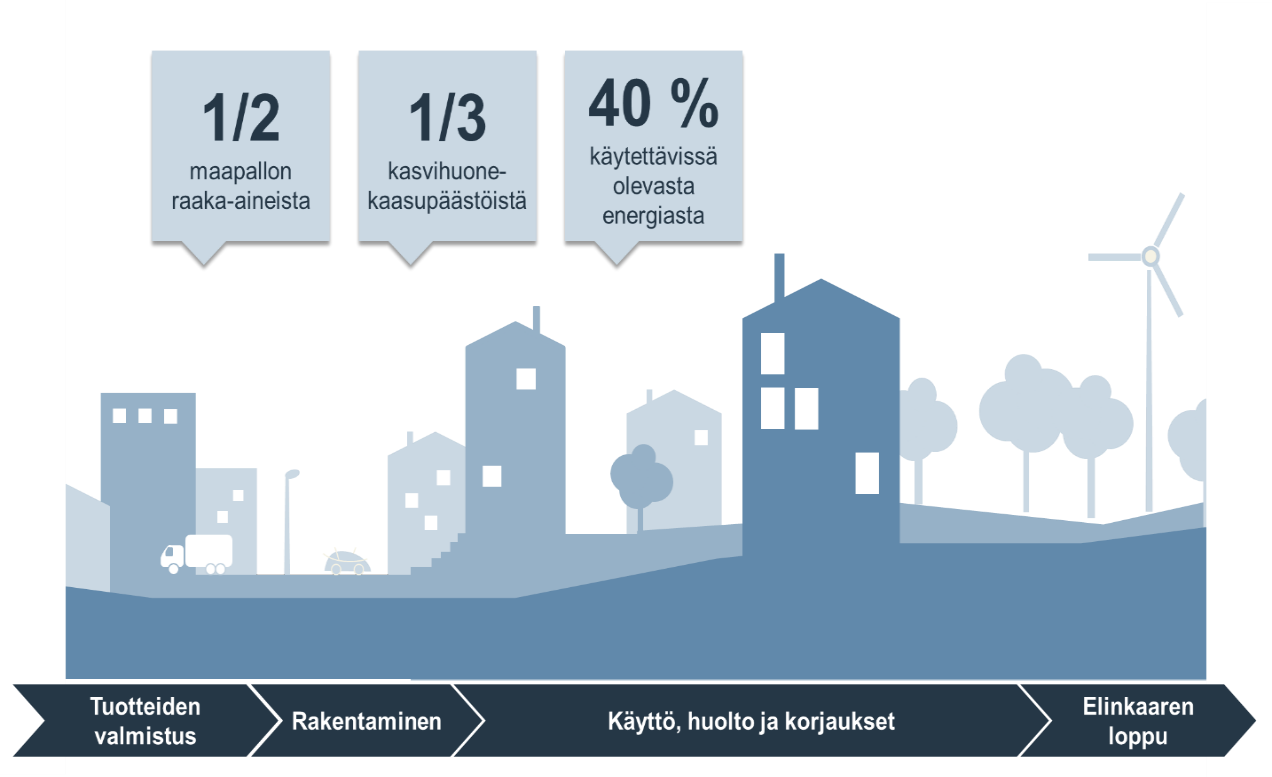 Byggande och den byggda miljön är en betydande resurskonsument. Varje år står byggsektorn för ungefär hälften av världens konsumtion av råmaterial Herczeg, McKinnon, Milios, et al. (2014). Resource efficiency in the building sector. Slutrapport till DG Miljö. . Inom byggverksamhet och byggnader förbrukas omkring 40 procent av den primärenergi som används Cao, Dai & Liu (2016). "Building energy-consumption status worldwide and the state-of-the-art technologies for zero-energy buildings during the past decade", Energy and Buildings 128:198-213. . Samtidigt producerar den byggda miljön (byggande, uppvärmning av byggnader och elförbrukning) cirka en tredjedel av de globala växthusgasutsläppen Pomponi & Moncaster (2016). “Embodied carbon mitigation and reduction in the built environment – what does the evidence say?” Journal of Environmental Management 181 (687-700). , och andelen är densamma också i Finland Gaia Consulting (2020). Vähähiilinen rakennusteollisuus 2035. Osa 1. Rakennetun ympäristön hiilielinkaaren nykytila. Byggnadsindustrin RT rf. . Byggnadernas så kallade inbäddade utsläpps Till inbäddade utsläpp räknas tillverkning, transport och återvinning av byggmaterial samt utsläpp till följd av byggande, renovering och rivning. relativa andel av utsläppen under byggnadens livscykel ökar i och med att byggnadernas energiprestanda förbättras och växthusgasutsläppen under byggnadens användningstid minskar. Röck, Mendes Saade, Balouktsi, m.fl. (2019).”Embodied GHG emissions of buildings – The hidden challenge for effective climate change mitigation”. Applied Energy 258:114107. Byggmaterialens andel av växthusgasutsläppen under byggnadens livscykel är betydande. Beroende på byggnadens storlek varierar i nuläget andelen inbäddade utsläpp i energieffektiva nordiska byggnader från omkring 30 procent till rentav över 80 procent Kuittinen & Häkkinen (2020). Kohti vähähiilistä rakentamista. Opas arviointiin ja suunnitteluun. Rakennustieto. . På grund av den byggda miljöns betydande inverkan på utsläppen har forskare framhållit att ett uppnående av klimatavtalet från Paris förutsätter att nya byggnader uppförs klimatneutralt efter 2030 Rockström, Gaffney, Rogelj et al. (2017). ”A roadmap for rapid decarbonization”. Science 355 (6331). och att i synnerhet utsläppen från tillverkningen av byggmaterial minskas betydligt Material Economics (2018). Circular Economy – A Powerful Force for Climate Mitigation. Sitra. .