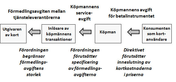 Tjänsteleverantörerna avtalar centraliserat eller bilateralt om den förmedlingsavgift som köpmannens transaktionsinlösare ska betala till utgivaren av kortet. Förordningen begränsar förmedlingsavgiften för debetkort till högst 0,2 procent och för kreditkort till högst 0,3 procent. Nationellt kan lägre förmedlingsavgifter än så bestämmas för rent inhemska transaktioner (se närmare punkt 3.1.4). Köpmannen betalar en serviceavgift till sin transaktionsinlösare och förordningen förutsätter att förmedlingsavgiftens andel av serviceavgiften specificeras för köpmannen. Inlösarens serviceavgift för sina egna tjänster blir därför också transparent för köpmannen.