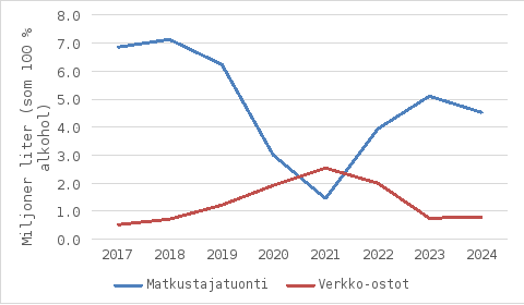 Alkoholijuomien matkustajatuonti ja verkko-ostaminen 2023. Tilastoraportti 10/2024, 1.3.2024. THL.