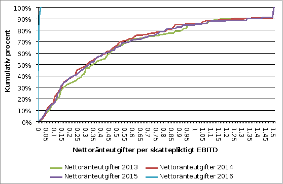 Ränteutgifter som överstiger ränteinkomsterna kan enligt 18 a § dras av till den del de utgör högst 25 procent av näringsverksamhetens resultat med beaktande av nämnda tillägg och avdrag. Nettoränteutgifter som överstiger den procentuella andelen är inte avdragsgilla, vilket innebär att beloppet av avdragsgilla nettoränteutgifter också kan understiga 500 000 euro. Alla ränteutgifter som betalats till parter som inte är i intressegemenskap är dock avdragsgilla och maximibeloppet av icke avdragsgilla nettoränteutgifter är beloppet av nettoränteutgifter mellan företag i intressegemenskap.
